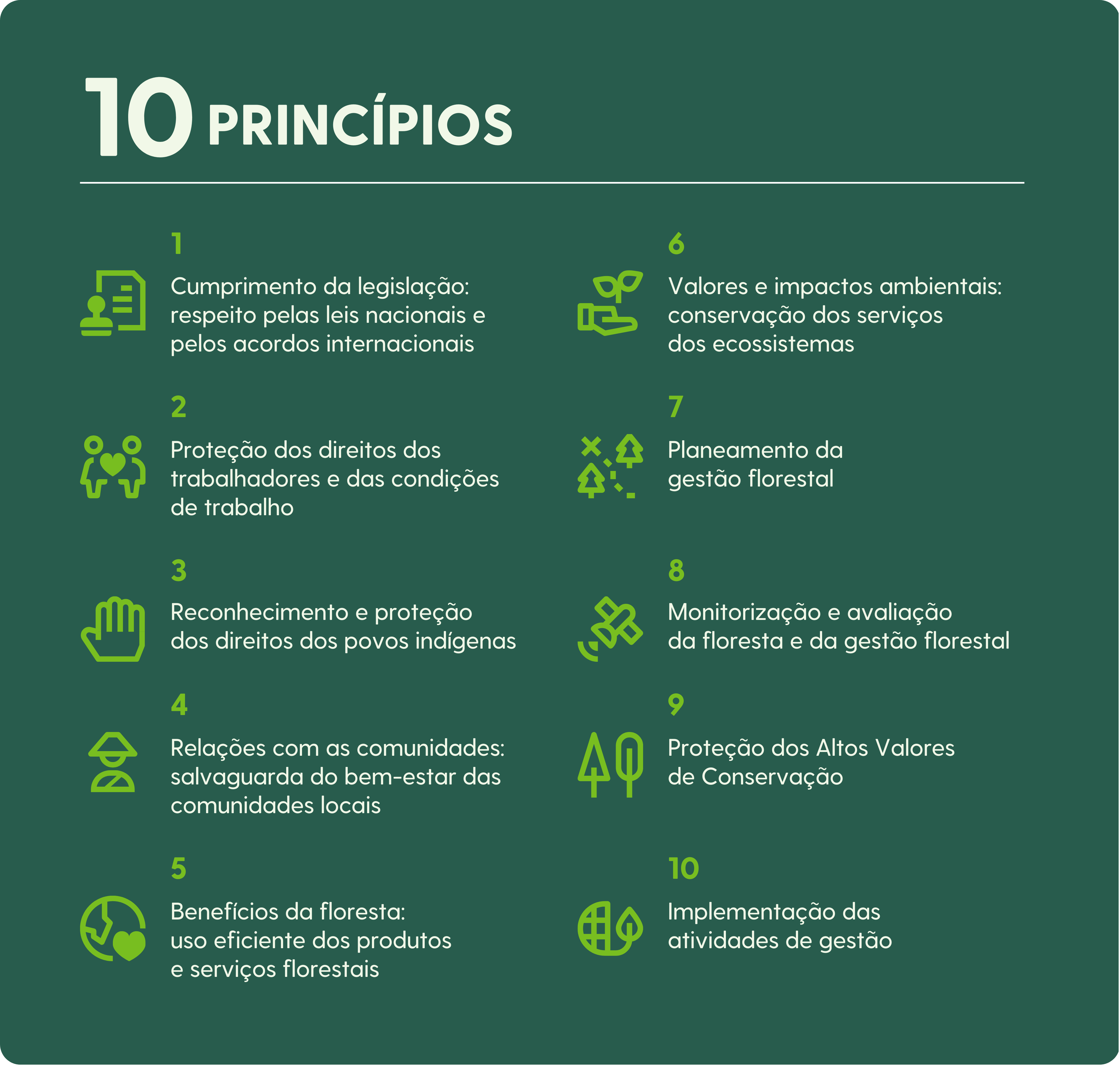 Os Princípios e Critérios aplicam-se a todos os tipos de floresta e a todas as áreas dentro da Unidade de Gestão Florestal, incluída no âmbito do certificado. São aplicáveis no mundo inteiro e relevantes para os diversos ecossistemas, bem como para vários sistemas culturais, políticos e legais, não sendo específicos para um país ou região em particular.