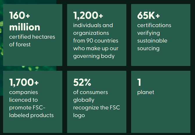 Globalmente, a marca FSC é o símbolo mais reconhecido e confiável pelos consumidores para produtos florestais*. A certificação FSC garante que as florestas são protegidas e que os materiais são obtidos de forma responsável, desde a floresta até ao consumidor.