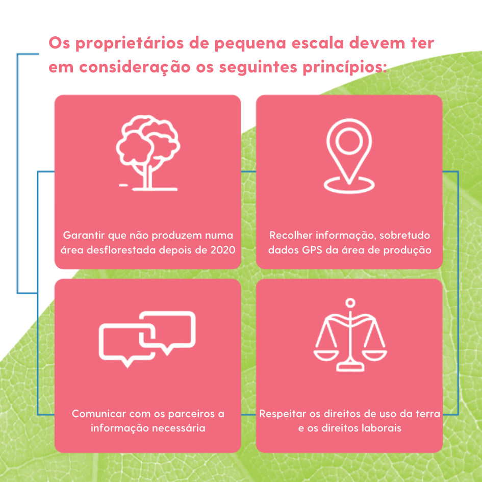 Os pequenos proprietários que não colocam estes produtos no mercado da UE não têm obrigações legais diretas. No entanto, os seus parceiros comerciais, por exemplo compradores, podem pedir-lhes que forneçam informações sobre a sua produção, especialmente sobre as áreas de produção. Os parceiros comerciais necessitam destas informações para cumprirem com as suas próprias obrigações ao abrigo do regulamento.