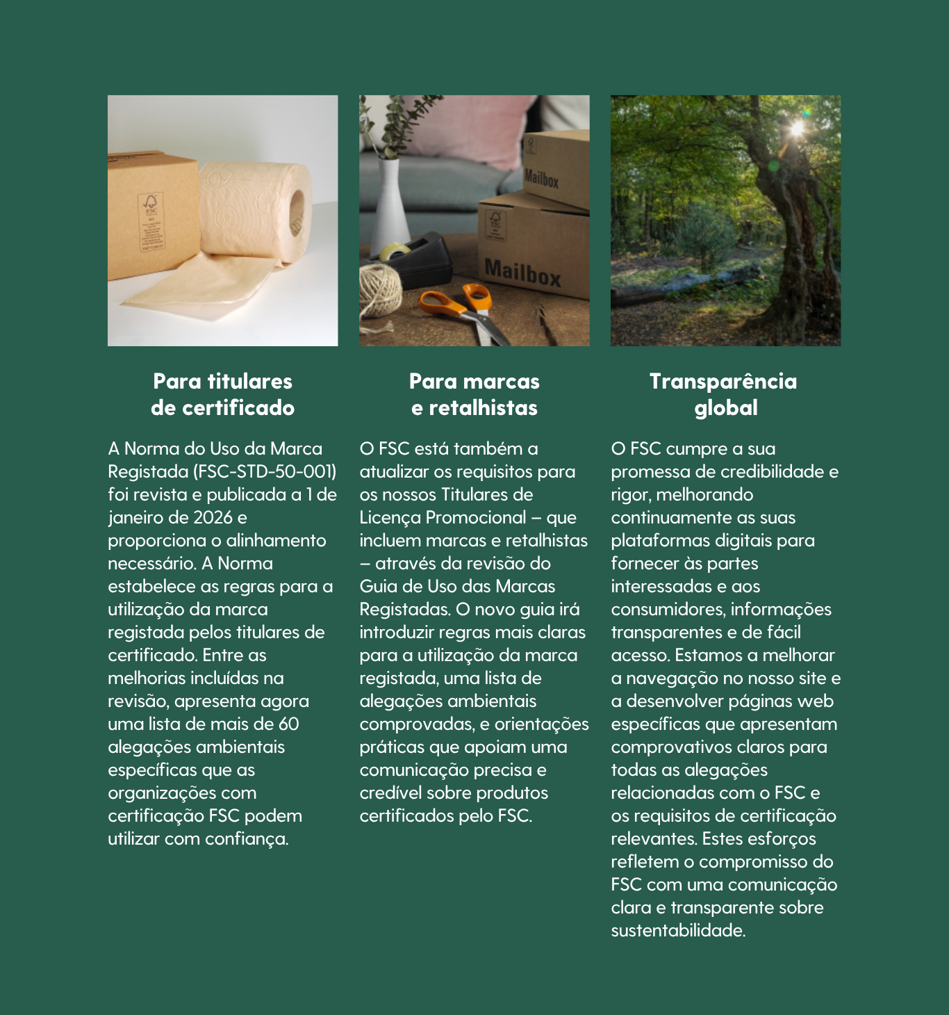 O FSC apoia firmemente as legislações e iniciativas mundiais destinadas a combater o greenwashing, com o objetivo comum de garantir que as alegações e comunicações ambientais não induzam os consumidores em erro, e apoia os titulares de certificado e de licença promocional para que continuem a comunicar sobre o FSC de forma credível.