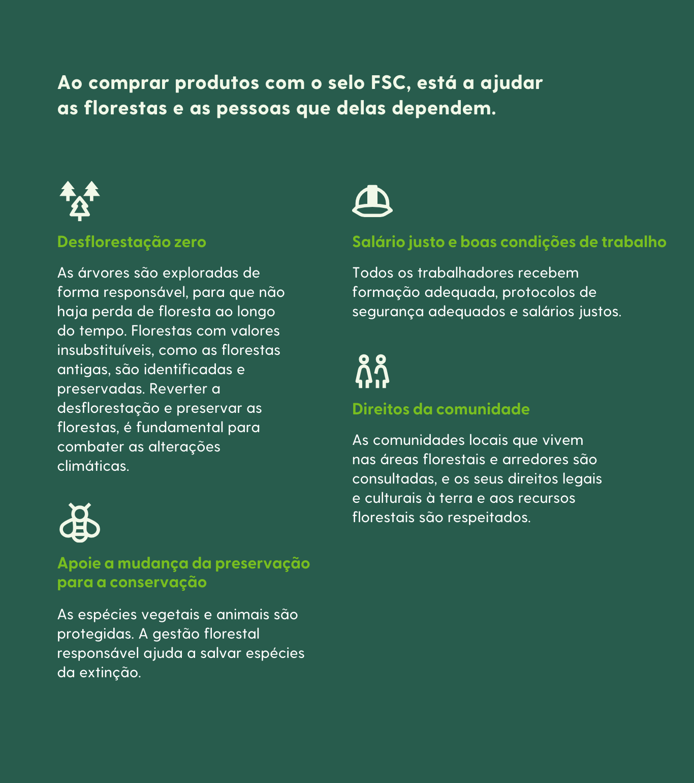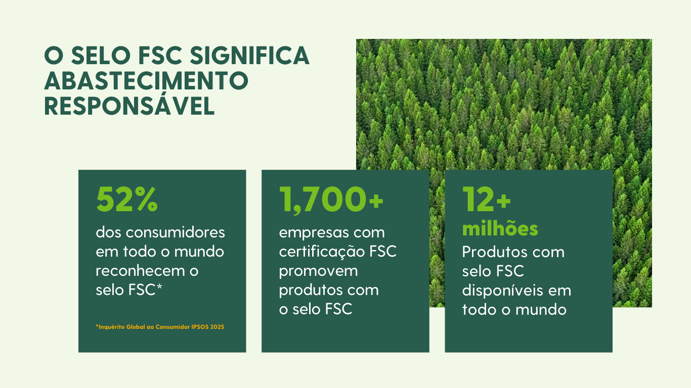 Essa licença permite que as organizações usem a marca FSC nos seus materiais promocionais, mostrando o seu compromisso com a resiliência das florestas. Mais da metade dos consumidores em todo o mundo reconhece a marca FSC, tornando-a um aliado para as suas metas ESG (práticas ambientais, sociais e de boa governança).