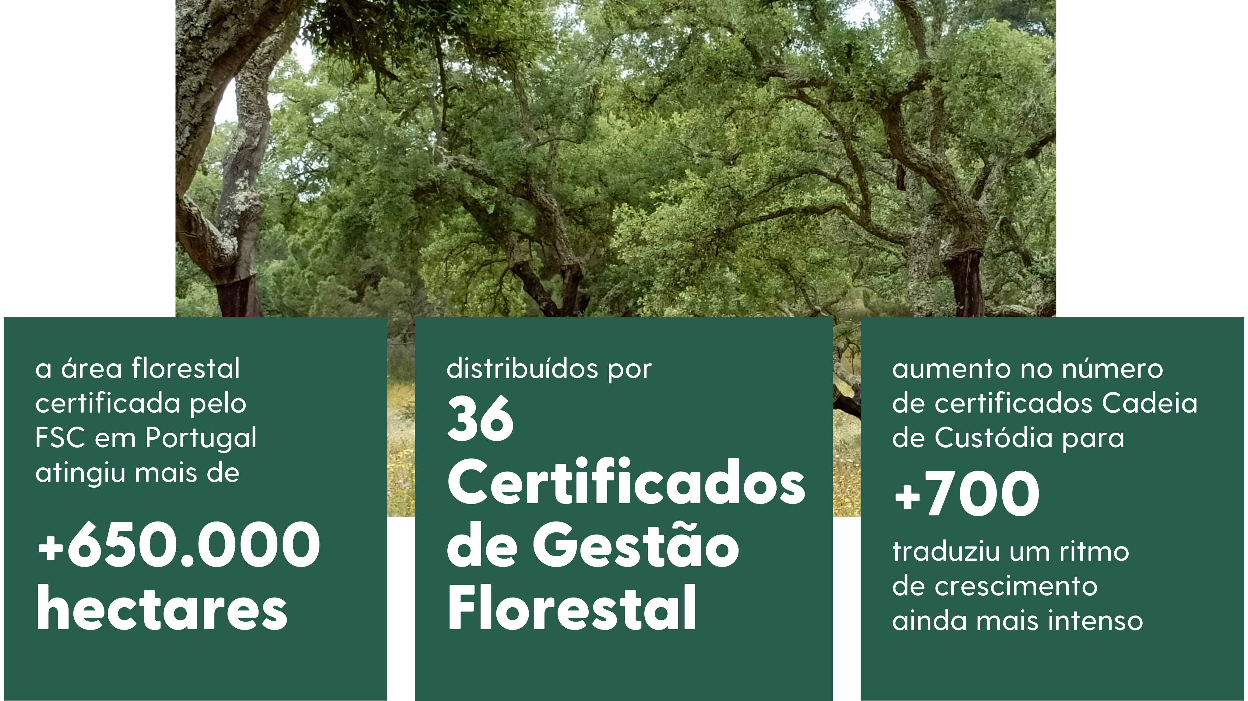 Cerca de vinte anos depois, a área florestal certificada pelo FSC em Portugal atingiu mais de 650.000 hectares, distribuídos por 36 Certificados de Gestão Florestal, e o aumento no número de certificados de Cadeia de Custódia (para mais de 700) traduziu um ritmo de crescimento ainda mais intenso.