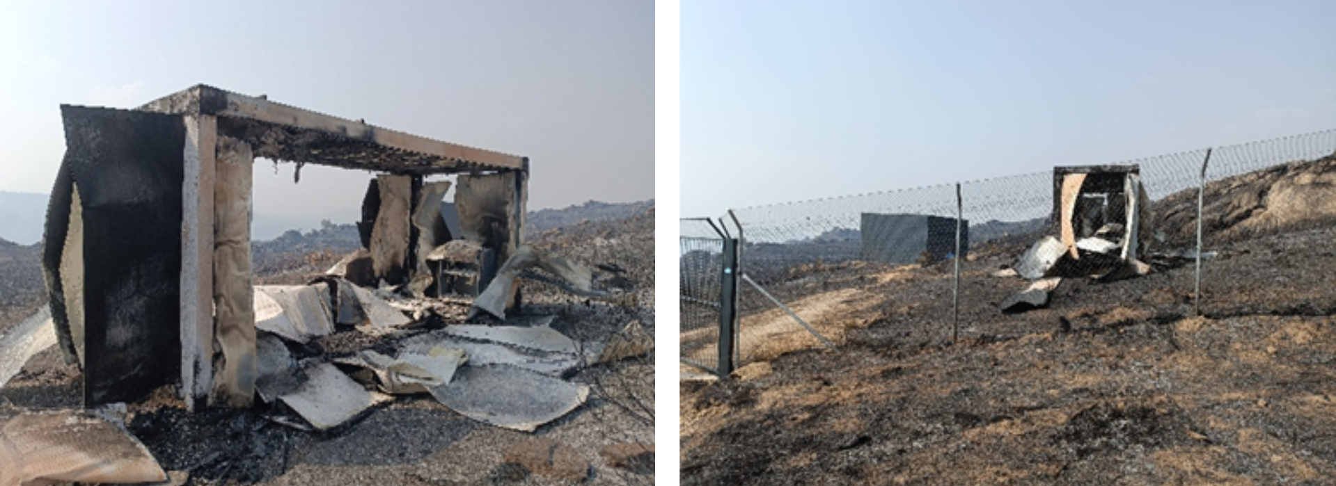 A manhã do dia 18 de agosto revelaria os prejuízos causados na estação de aclimatação. Apesar de em toda a volta, e por uma vasta extensão, a vegetação estar cortada, precisamente como medida preventiva implementada pela Palombar no âmbito do projeto LIFE Aegypius Return – ao abrigo do Plano de Gestão de Habitats e de Redução do Risco de Incêndio em Territórios de abutre-preto na Zona de Proteção Especial Douro Internacional e Vale do Águeda –, e ser muito rasteira, o fogo devastou todo o habitat. A jaula das aves teve alguns danos ligeiros, mas o contentor de apoio foi totalmente destruído. Este espaço funcionava como enfermaria e como centro digital de videovigilância das instalações. O campo de alimentação em frente à jaula de aclimatação foi também inteiramente queimado, o que impossibilita a sua função, no imediato.